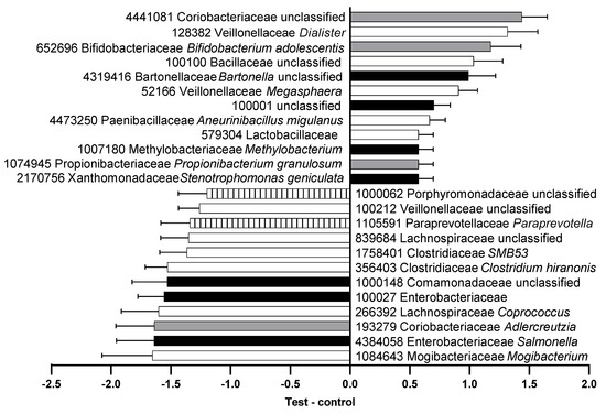 Relative abundance (center log-ratio) of the difference between feces from the test and control food groups in operational taxonomic units (OTU) that were significantly different. OTU number, family, and genus are shown with species where available. Black, phylum Proteobacteria; gray, phylum Actinobacteria; white, phylum Firmicutes; striped, phylum Bacteroidetes.