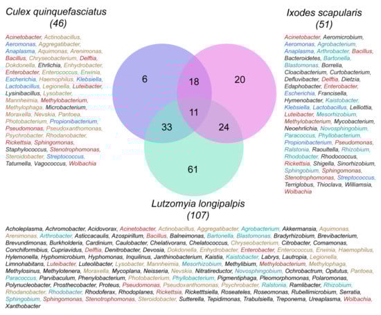 The scientific and medical communities have directed most of their attention to the discovery and characterization of the many microbial pathogens responsible for these vector-borne infectious diseases. Not surprisingly, non-pathogenic microbiota were largely neglected. Recently, however, the role of these microbial symbionts in blood-sucking arthropods has received considerable attention, including diverse vector insects and ticks [6,7,8,9,10]. Knowledge of the complexity of the microbiomes of insect and acarine vectors has increased greatly in recent years thanks to the availability of powerful sequencing platforms, such as Next-Gen sequencing and/or similar technologies. The results of these investigations have made it possible to assess the importance of symbiotic bacterial phyla, families, and even distinct bacterial species for the health of blood-feeding insect and acarine vectors. We now realize that the association between bacteria and animals is a very ancient phenomenon, with most bacteria co-existing in a beneficial symbiotic relationship [11]. Moreover, in-depth analysis of changes in relative abundance of diverse microbiota during development, blood feeding and reproduction has enhanced our understanding of the contributions of these microbes to vector health (fitness) and even pathogen survival and transmission to vertebrate hosts. These vector insects and acarines acquire a portion of their microbiota from their vertebrate hosts [12] or from the external environment, but all share the same food source (blood) and often share similar host body conditions (e.g., temperature). Consequently, if blood were the predominant factor acting on these microbes, one might expect that there would be substantial similarity in the composition of their microbiomes. However, blood lacks some essential metabolites, e.g., thiamine, pyridoxine, folate and other B-vitamins [13], that are required for the parasite’s metabolism, and instead these ectoparasites must rely on their microbiota to compensate for these missing nutrients. Consequently, we may ask, do the same microbes provide these essential nutrients to most or all the different vector arthropods?