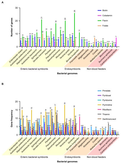 Comparison of the number of genes coding for different vitamins expressed by 18 symbiotic bacteria in blood-feeding insects and ticks versus three symbiotic bacteria in plant-feeding insects. Differences between enteric bacterial symbionts versus endosymbionts also are compared. (A) Biotin, cobalamin, flavin and folate. (B) Pimelate, pyridoxal, pyridoxine, riboflavin, thiamin and xanthine/uracil. Results show bacterial symbionts (both enteric and endosymbiont) in blood-feeding arthropods express significantly more genes coding for diverse vitamins than non-blood feeding insects.