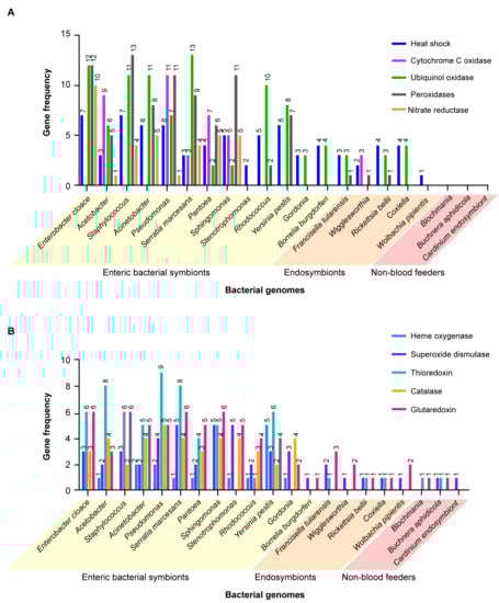 Comparison of the number of genes coding for different proteins for coping with various cell stressors expressed by 18 symbiotic bacteria in blood-feeding insects and ticks versus three symbiotic bacteria in plant-feeding insects. (A) Heat shock protein (mostly HSP60, HSP70 and HSP90), cytochrome C, ubiquinol, peroxidase and nitrate. (B) Heme oxygenase, superoxide dismutase, thioredoxin, catalase and glutaredoxin.