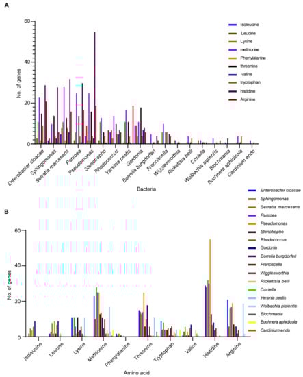We also compared the contributions of the essential amino acids that the enteric and endosymbiont bacteria of blood-feeding insects and ticks contribute versus those from the bacterial symbionts of non-blood-feeding insects. Figure 7A shows the results in graphic form. When analyzed using one-way ANOVA, the results were highly significant (F = 4.866, p < 0.0001, 17, 162 DF). When comparisons were made using Dunnet’s test for multiple comparison of the essential amino acids in the different bacteria against the plant feeder B. aphidicola, four of the 10 enteric bacteria, E. cloacae, S. marcesans, Pantoea and Pseudomonas, were highly significantly different from the plant feeder symbiont, B. aphidicola (Supplemental Table S8). However, when compared using the t-test, all other enteric bacteria were significantly different from B. aphidicola, namely, Sphingomonas (t = 2.28, p < 0.05), Stenotrophomonas (t = 2.82, p < 0.02) and Rhodococcus (t = 5.03, p < 0.001), as well as the other enteric bacteria previously shown to be significantly different. These findings provide additional support for the enteric bacteria providing essential nutritional benefits for the blood-feeding insect and tick vectors. Figure 7B shows the same data but with the ten different amino acids on the horizontal axis. Four amino acids, methionine, threonine, histidine and arginine, were the amino acids with the highest gene frequency.