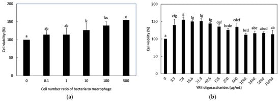 Effects of L. lactis SG-030 and oligosaccharides on the cell viability of RAW 264.7 cells. (a) Effect of L. lactis SG-030 on RAW 264.7 cell viability; (b) Effect of oligosaccharides on RAW 264.7 cell viability. Different letters show significant differences among groups at p < 0.05 (n ≥ 3). YRK-oligosaccharides: glucooligosaccharides from W. cibaria YRK005.