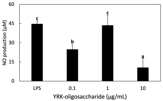 Effect of glucooligosaccharides on NO production in RAW 264.7 cells. RAW 264.7 cells were treated with various concentrations of oligosaccharides for 1 h and then treated with 1 μg/mL LPS for 24 h. NO production was evaluated using the Griess reaction assay. Different letters show significant differences among groups at p < 0.05 (n ≥ 3). YRK-oligosaccharides, oligosaccharides from W. cibaria YRK005; LPS, lipopolysaccharides.