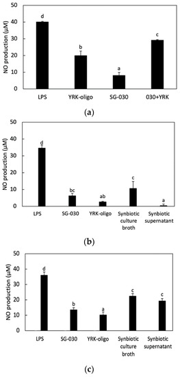 Effects of synbiotics on nitric oxide production in RAW 264.7 cells. (a) RAW 264.7 cells were treated with L. lactis SG-030 alone, oligosaccharides alone, or synbiotics in the combination of L. lactis SG-030 and glucooligosaccharides; (b) RAW 264.7 cells were treated with L. lactis SG-030 alone, 0.1 μg/mL oligosaccharides alone, synbiotic culture broth, or the supernatant of synbiotics culture; (c) RAW 264.7 cells were treated with L. lactis SG-030 alone, 0.5 μg/mL oligosaccharides alone, synbiotic culture broth, or the supernatant of synbiotics culture, Different letters show significant differences among groups at p < 0.05 (n ≥ 3). LPS, lipopolysaccharides; SG-030, L. lactis SG-030; YRK-oligo, 0.1 μg/mL or 0.5 μg/mL of oligosaccharides from W. cibaria YRK005; 030 + YRK, combination of L. lactis SG-030 and oligosaccharides from W. cibaria YRK005.