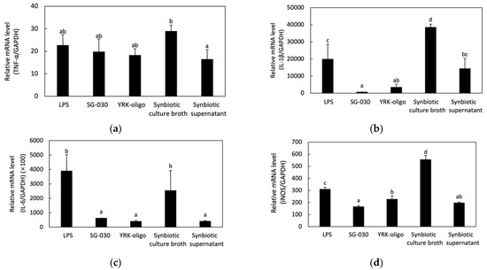Effects of synbiotics on the mRNA expression of cytokine genes and iNOS gene in RAW 264.7 cells. (a) Relative mRNA expression level of TNF-α gene; (b) Relative mRNA expression level of IL-1β gene; (c) Relative mRNA expression level of IL-6 gene; (d) Relative mRNA expression level of iNOS gene. RAW 264.7 cells were treated with L. lactis SG-030 alone, oligosaccharides alone, symbiotic culture broth, and symbiotic supernatant. (n ≥ 3). LPS, lipopolysaccharides; SG-030, L. lactis SG-030; YRK-oligo, 0.5 μg/mL of oligosaccharides from W. cibaria YRK005. Different letters show significant differences among groups at p < 0.05 (n ≥ 3).