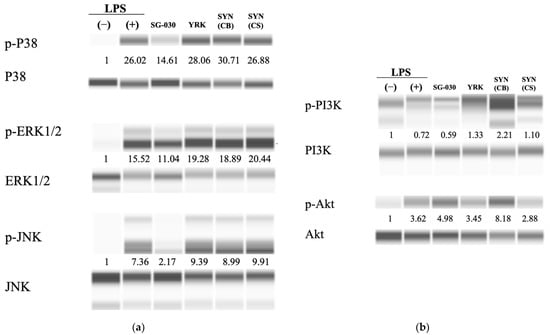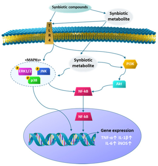 The expression levels of PI3K and Akt also increased with a similar tendency with MAPKs, and were the highest in cells treated with synbiotic culture broth (Figure 5b). These results indicated that synbiotics combined with oligosaccharides and L. lactis SG-030 induced phosphorylation of Akt, PI3K, P38, ERK1/2, and JNK, and activated those cytokines. This suggested that the PI3K/Akt and MAPKs pathways were involved in activating macrophages by treatment of synbiotics, leading to secretion of TNF-α, IL-1β, and IL-6, which regulate the immune response [39,46].