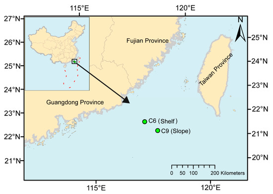 Location of the study area in northern South China Sea map showing the stations sampled. Sampling was carried out at Station C6 (117.46° E, 22.13° N) at the surface and DCM, which is on the continental shelf with a depth of 77 m; and Station C9 (117.99° E, 21.69° N) at the surface, DCM and Bottom, which is on the continental slope with a depth of 1369 m.