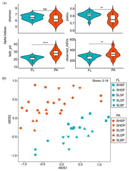 (a) Differences in alpha diversity between FL and PA communities. One-side significance based on bootstrapping test was expressed as **** p < 0.001; ** p < 0.05; ns > 0.05. (b) Two-dimensional NMDS ordination using Bray–Curtis indices of bacterioplankton communities. The samples were collected in June 2016 in MACRO cruise, and samples grouped by two size fractions (free living and particle associated), different stations (Slope and Shelf) and depth (Surface, DCM and Bottom). Site names: SL = Slope, SH = Shelf, S = Surface, D = DCM, B = Bottom, F = fre -living and P = particle associated (Table S2). The numbers of replicated samples in this figure are as follows: In FL, SHSF (n = 4), SHDF (n = 4), SLSF (n = 5), SLDF (n = 4), SLBF (n = 3); in PA, SHSP (n = 4), SHDP (n = 4), SLSP (n = 6), SLDP (n = 5), SLBP (n = 6).