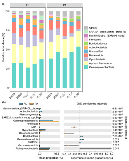 Gammaproteobacteria (39.02%) was the dominant subphylum in all the microbial communities, followed by Alphaproteobacteria (23.14%), Bacteroidota (11.64%), Cyanobacteria (9.60%), Actinobacteria (3.20%), Bdellovibrionota (1.83%), SAR324_clade (Marine_group_B) (1.45%), Marinimicrobia_(SAR406_clade) (1.43%) and Firmicutes (1.06%) (Figure 3a). We further analyzed the compositions of the FL and PA communities. Significantly higher abundances of Marinimicrobia_(SAR406_clade), Actinobacteria, SAR324_clade (Marine_group_B), Alphaproteobacteria and Cyanobacteria were found in the FL community than in the PA community (Welch’s t-test, p < 0.05, Figure 3b). By contrast, the abundances of Gammaproteobacteria, Planctomycetota, Firmicutes, Verrucomicrobiota and Desulfobacterota were significantly higher in the PA than those in the FL community (Welch’s t-test, p < 0.05, Figure 3b).