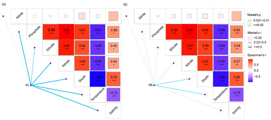 Environmental drivers of bacterioplankton community in continental shelf and slope regions evaluated by Mantel tests. Edge width corresponds to R value and edge color indicates statistical significance. Color gradient represents Spearman correlation coefficients between environmental variables. Asterisks indicate significance (* p < 0.05; ** 0.05 < p < 0.01; *** p < 0.01). (a) Free-living community. (b) Particle-associated community.