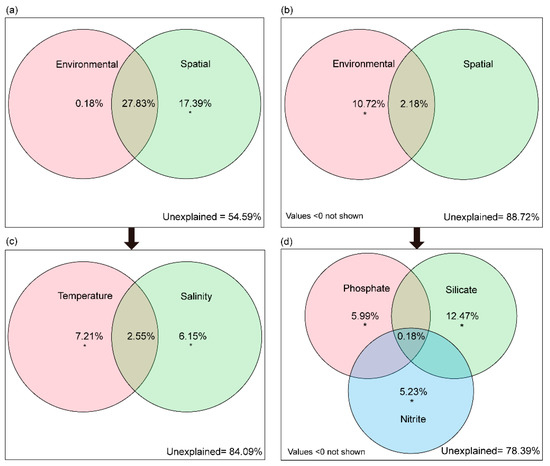 Venn diagrams of variation partitioning analysis showing the effects of spatial and environmental factors on the bacterioplankton communities. The percentage of variation explained by each factor, including unique, shared and unexplained is shown in corresponding positions in the diagram. When no numbers are shown, this matrix had no explanatory wer (zero or negative). Asterisks represent statistical significance: * p < 0.05, as estimated using canonical correspondence analysis. FL community (a,c); PA community (b,d).