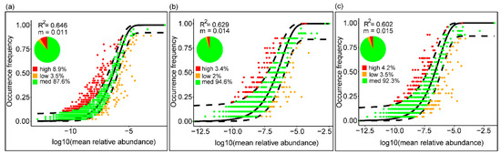 Moreover, NCM [54] was also used to assess the potential contribution of stochastic processes to the assembly of bacterial communities by modeling and predicting the relationship between ASVs relative abundance and their occurrence frequency across the wider meta-community. The influences of drift (birth-death immigration process) and stochastic dispersal processes can be incorporated in this neutral model. The R2 values represent the goodness of fit to the NCM, and larger values of R2 indicate stochastic dispersal and ecological drifts are more important than selection in community assembly by the neutral model [54,55]. Model calculations were performed using the minpack.lm and HMisc packages in R [55,56].