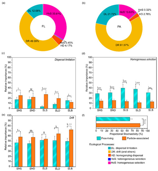 Doughnut and bar plots displaying the relative influences of assembly processes governing community turnover. (a) free-living community. (b) particle-associated community. (c) Changes of homogeneous selection under particle associated (orange bar) and free living (aqua bar). (d) Changes of dispersal limitation. (e) Changes of drift. (f) Stochasticity estimated by iCAMP under particle associated (orange bar) and free living (aqua bar). One-side significance based on bootstrapping test was expressed as *** p < 0.01; ** p < 0.05; * p < 0.1. p = 0.0061, 0.0000, 0.0139, 0.0000, 0.0000 in 5 different groups for homogeneous selection; p = 0.1129, 0.2884, 0.0000, 0.0330, 0.2595 for dispersal limitaton; p = 0.0962, 0.0706, 0.3861, 0.1067, 0.0000 for drift, respectively. L, M, S and N represented large (|d| > 0.8), medium (0.5 < |d| ≤ 0.8), small (0.2 < |d| ≤ 0.5) and negligible (|d| ≤ 0.2) effect sizes of size-fraction, based on Cohen’s d (the mean difference between particle associated and free living divided by pooled standard deviation). Data are presented as mean values ± SD. Error bars represented standard deviations. (c,d,f) n ≥ 3 biologically independent samples at each group.