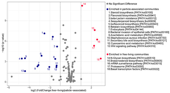 Metagenome inference from the normalized feature tables was performed using PICRUSt2. The weighted nearest sequenced taxon index (NSTI) values ranged between 0.08–0.19 (average 0.12) for the PA communities and 0.1~0.16 (average 0.12) for the FL lineages, indicating that these ASVs were representative of the reference genome database used and could generate reasonable functional predictions. In this study, we inferred the metagenome of the communities using PICRUSt2, and searched for specific genes and metabolic pathways predicted to be differentially abundant between the PA and FL communities (Figure 8). As shown in Figure 8, more pathways were enriched in the PA community compared with the FL community, consistent with the generally larger genomes and richer metabolic capacities of particle-associated bacteria [59]. The enriched pathways in the PA community were related to secondary metabolites, such as steroid biosynthesis, secondary bile acid biosynthesis, sesquiterpenoid biosynthesis, flavonoid biosynthesis, isoflavonoid biosynthesis, arachidonic acid metabolism and betalain biosynthesis. The additional enriched pathways in the PA community were for Staphylococcus aureus infection, bacterial invasion of epithelial cells and endocytosis. Regarding nutrient metabolism, pathways we found included cyanoamino acid metabolism, which plays a vital role in the nitrogen metabolism of marine microbe [60]. Pathways related to antibiotic resistance were also significantly enriched in the PA community, such as beta-Lactam resistance. Only five pathways were enriched in the FL community compared with the PA community, consistent with their typically smaller genomes. These pathways were related to N-glycan biosynthesis, brassinosteroid biosynthesis, mRNA surveillance pathway, basal transcription factors and the proteasome.