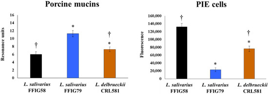 Adhesion of Lactobacillus delbrueckii subsp. lactis CRL 581 to porcine intestinal epithelial (PIE) cells and porcine mucins. The porcine Ligilactobacillus salivarius strains FFIG58 and FFIG79, which are highly adherent to PIE cells and porcine mucins, respectively, were used for comparisons. The results represent data from three independent experiments. Asterisks indicate significant differences when compared to the FFIG58 strain (* p < 0.05). Symbols indicate significant differences when compared to the FFIG79 strain († p < 0.05).