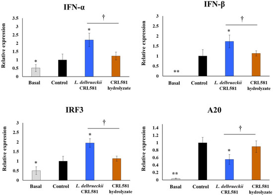 Modulation of the innate antiviral immune response triggered by Toll-like receptor 3 (TLR3) activation in murine macrophages by Lactobacillus delbrueckii subsp. lactis CRL 581. RAW 264.7 cells were stimulated with L. delbrueckii subsp. lactis CRL 581 or its β-casein hydrolysate (CRL 581 hydrolysate) and challenged with poly(I:C) to induce the activation of TLR3. RAW 264.7 cells with no treatment (basal) or challenged only with poly(I:C) (control) were used as controls. The expressions of tumor necrosis factor (TNF)-α, interleukin 1α (IL-1α), and IL-1β were analyzed by qPCR after 12 h of TLR3 activation. The results represent data from three independent experiments. Asterisks indicate significant differences when compared to the control group (* p < 0.05). Symbols indicate significant differences between the indicated groups († p < 0.05).