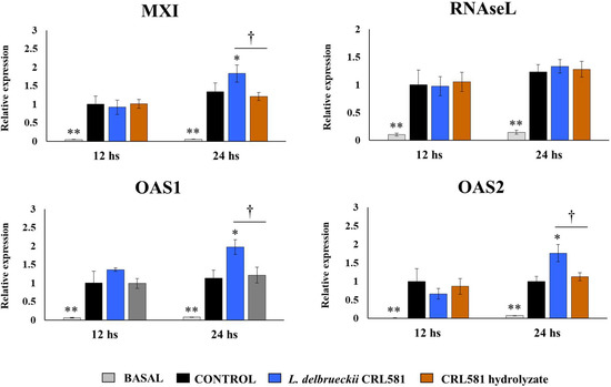 Considering that L. delbrueckii subsp. lactis CRL 581 augmented the expression of type I IFNs, we also analyzed the changes in the expression of antiviral factors that are regulated by IFNs including Mx1, RNAseL, OAS1, and OAS2 (Figure 3).
