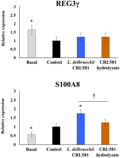 In contrast, poly(I:C) stimulation augmented the levels of S100A8 in PIE cells. Of note, PIE cells treated with L. delbrueckii subsp. lactis CRL 581 had significantly higher levels of S100A8, while cells treated with the CRL 581 hydrolysate were not different from controls (Figure 4). The expressions of Mx1, RNAseL, OAS1, and OAS2 in PIE cells stimulated with the CRL 581 hydrolysate were not different from controls at hour 24 after poly(I:C) challenge (Figure 3).