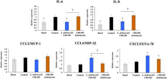 PIE cells treated with L. delbrueckii subsp. lactis CRL 581 had significantly lower levels of IL-6 and IL-8 than the controls (Figure 5). Furthermore, the levels of these two cytokines had values that were comparable to those observed in the basal group. In addition, CRL 581-stimulated PIE cells showed a higher expression of CCL4/MIP-1β and CXCL5/ENA-78 than controls after the challenge with poly(I:C). The expressions of the inflammatory cytokines and chemokines in PIE cells stimulated with the CRL 581 hydrolysate were not different from controls after poly(I:C) challenge with the exception of CXCL5/ENA-78 that was increased in the hydrolysate-treated cells (Figure 5).