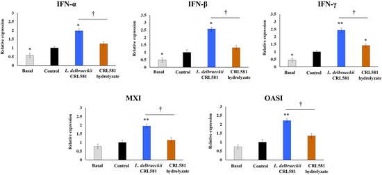 The challenge of macrophages with poly(I:C) increased the expression of immune factors evaluated in all experimental groups. However, macrophages treated with L. delbrueckii subsp. lactis CRL 581 had significantly higher levels of IFN-α, IFN-β, IFN-γ, Mx1, and OAS1 than the control groups (Figure 6). The expressions of the antiviral factors in macrophages stimulated with the CRL 581 hydrolysate were not different from controls after poly(I:C) challenge, with the exception of IFN-γ which was increased in the hydrolysate-treated cells (Figure 6). Of note, the expression levels of IFN-γ in hydrolysate-treated cells were statistically different from the observed levels in macrophages stimulated with L. delbrueckii subsp. lactis CRL 581.