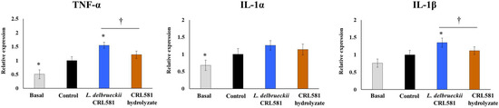 Interestingly, macrophages stimulated with L. delbrueckii subsp. lactis CRL 581 had significantly higher levels of TNF-α and IL-1β than controls, while no effect of this strain was detected for the expression of IL-1α. The expressions of the three inflammatory cytokines in macrophages stimulated with the CRL 581 hydrolysate were not different from controls after the poly(I:C) challenge (Figure 7).