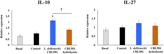 Finally, changes in regulatory cytokines produced by macrophages in the context of TLR3 activation were evaluated. As shown in Figure 8, poly(I:C) stimulation did not induce significant changes in the expression of IL-27 at 12 h post-challenge. Neither L. delbrueckii subsp. lactis CRL 581 nor the CRL 581 hydrolysate were able to induce changes in the expression of IL-27 by macrophages after the activation of TLR3. Of note, the CRL 581 strain significantly augmented the expression of IL-10 in macrophages while this effect was not observed for the CRL 581 hydrolysate (Figure 8).