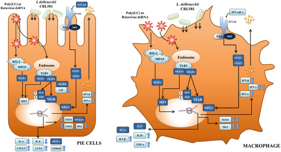 Previously, we found that L. delbrueckii spp. lactis CRL 581 is able to modulate intestinal inflammatory cytokine and chemokine profiles triggered by TLR3 activation in poly(I:C)-challenged mice and is able to protect against mucosal inflammatory damage [18] in a manner similar to that observed for the well-characterized immunobiotic strain L. rhamnosus CRL1505 [22,40,64,65]. These results allowed us to speculate that the CRL 581 strain, similar to L. rhamnosus CRL1505, would be capable at modulating the expressions of inflammatory factors in IECs. TLR3 pathway has the ability to promote protective immunity as well as inflammatory tissue damage. In this regard, it was shown that IECs produce inflammatory cytokines and chemokines in response to TLR3 activation by rotavirus, including IL-6, IL-8, GM-CSF, and chemokines. As described above, these inflammatory mediators are crucial for the protection against viral pathogens through their direct antiviral effects [66] and the recruitment and activation of immune cells [6]. However, the uncontrolled and excessive infiltration of immune cells to the intestinal mucosa can contribute to local damage [67]. The appropriate regulation of TLR3 pathway is essential for complete protection against rotavirus without detrimental effects. In our hands, L. delbrueckii spp. lactis CRL 581 diminished the expression of IL-6 and IL-8 in poly(I:C)-challenged PIE cells while the immunobiotic strain augmented the expression of CCL4 and CXCL5 (Figure 9). In addition, excessive and uncontrolled production of TNF-α, IL-1β, IL-6, and other inflammatory cytokines by macrophages may result in serious systemic complications during viral infections such as tissue damage and septic shock [68,69]. Although the treatment of macrophages with L. delbrueckii spp. lactis CRL 581 augmented the expression of inflammatory factors, enhanced expression levels of the immunoregulatory cytokine IL-10 were also observed (Figure 9). This result is in line with our previous in vivo study in mice in which improved IL-10 levels were observed in the intestinal tract of CRL 581-treated mice after a poly(I:C) challenge [18]. It can be concluded that the differential regulation of inflammatory and anti-inflammatory factors induced by the CRL 581 strain in vivo could be associated with its ability to modulate the responses of both IECs and macrophages.