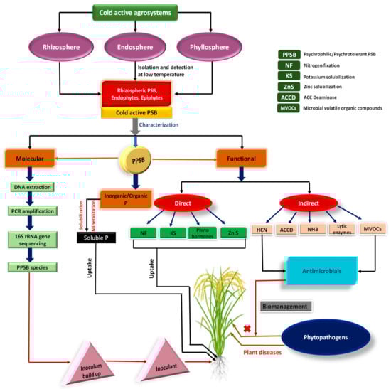 The concept of applying cold-adapted PSB among many cold-active PGPR makes it clear that the cold temperatures and poor growing seasons influence both versatile microbiomes and plants growing under cold/chilling temperatures. So, the discovery of novel cold-active PSB, which maintains their plant growth-promoting traits even under low-temperature environments and counterbalances the damaging effect of cold temperature, is indeed essentially needed to optimize food production in colder areas of the world. The mechanisms used by conventional PSM including bacteria, fungi, and actinomycetes to optimize crop production in different agroecosystems have been previously reviewed [172,199,200]. However, the mechanisms adopted by psychrophiles/psychrotrophs PSB to ameliorate crop production in a low-temperature environment have perhaps not been reviewed due largely to scanty literature on this aspect. Despite this, the literature available here and there on cold-active PSB including rhizosphere bacteria, epiphytes, and endophytes able to exhibit direct or indirect ameliorative effects on plants (Figure 1) are reviewed and discussed.