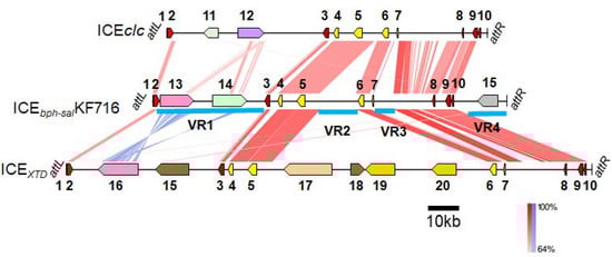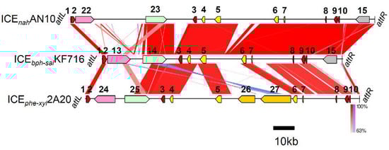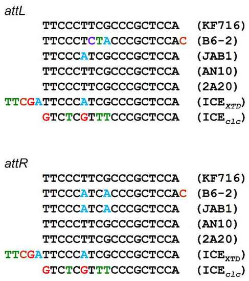 A search of the public database using BLAST revealed that an almost identical core region to that of ICEbph-salKF716 was found in other putative ICEs. The identities were higher than those of ICEclc or ICEXTD. Putative ICEs were identified from the genome sequences of P. putida B6-2 (accession number: NZ_CP015202) [24,25], P. alcaliphila JAB1 (CP016162) [26], P. stutzeri AN10 (NC_018028) [27], and P. stutzeri 2A20 (KT935509) [28]. They are flanked by directed repeat sequences corresponding to the attL and attR sites (Figure 2).