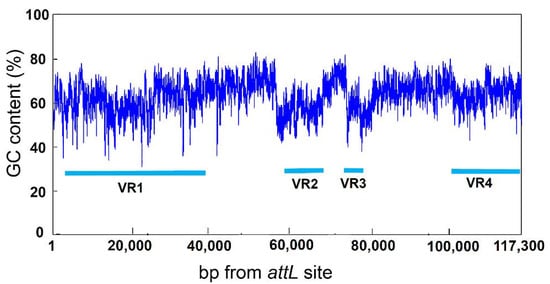 GC content of ICEbph-salKF716. The horizontal bars labeled VR1 to VR4 represent four variable regions.