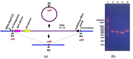 ICEs integrated into the chromosome can be excised from the chromosome to produce a circular form, and the host genome was repaired upon excision (Figure 6a). Attempts were made to detect the extrachromosomal circular form of ICEbph-salKF716 from total DNA isolated from P. stutzeri KF716 grown on biphenyl. The amplicons corresponding to the attP site (R1 in Figure 6a) of excised circular forms of ICEbph-salKF716, attB sites (R2) of excised closed forms of chromosome, and attL/attR sites (R3 and R4) of the integrated form were detected using PCR (Figure 6b). It has been reported that tRNA-Gly(CCC) locus is the insertion site of ICEbph-salKF716 [10]. DNA sequences of these amplicons matched the expected sequences compared to the total genome sequence of P. stutzeri KF716 [12].