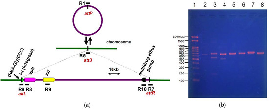 (a) Schematic representation of the integration of ICEbph-salKF716 into chromosome of P. aeruginosa PAO1. The horizontal bars labeled R5 to R10 are the DNA regions amplified by PCR. Primers attL3 and attR3 (sequences were given in Table S1) were used to amplify R5 including the attB site of the recipient strain. Primers attL1 and attL3 were used to amplify R6 including the attL site. Primers attR1 and attR3 were used to amplify R7 including the attR site. Primers bphL1 and bphR1 were used to amplify R8 including the bph gene. Primers salL1 and salR1 were used to amplify R9 including the sal gene. Primers MDL1 and MDR1 was used to amplify R10 including the putative gene for multi-drug efflux pump. (b) Detection of integrated from of ICEbph-salKF716 in transconjugant P. aeruginosa PAO1 by PCR. Lane 1, DNA ladder marker; Lane 2, R1 (attP); Lane 3, R5 (attB); Lane 4, R6 (attL); Lane 5, R8 (bph); Lane 6, R9 (sal); Lane 7, R10 (multi-drug efflux pump); Lane 8, R7 (attR).