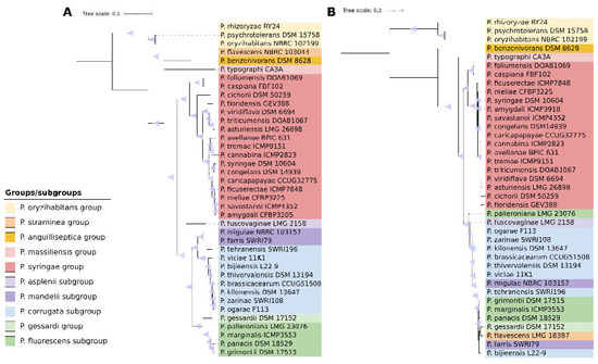 (A) Phylogram based on 576 core genes protein sequences from Pseudomonas type strains that possess acdS genes. The core genes (single copy genes found in all tested strains) were selected based on GHOSTKOALA functional annotation [66] and a python script built in house. The core genes were individually aligned using MAFFT [67] and concatenated using a python script built in house. The phylogenetic analysis was conducted in GalaxyPasteur server [68] using FastTree v2.1.10 [69], the LG model and a bootstrap of 100 replications. (B) Phylogram based on the AcdS sequences of Pseudomonas type strains. The sequences were obtained from the NCBI database and aligned using MAFFT [67]. The phylogenetic analysis was conducted in GalaxyPasteur server [68] using FastTree v2.1.10 [69], the LG model and a bootstrap of 1000 replications.