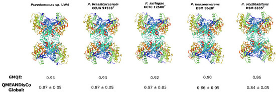Models of the different ACC deaminase enzymes from selected Pseudomonas. The models were created in Swiss-Model [73] using the crystal structure of ACC deaminase from Burkholderia (formerly Pseudomonas) sp. ACP as template (SMTL ID: 1tzm.1) [74]. GMQE—Global Model Quality Estimate; QMEANDisCo is a composite score for single model quality estimation.