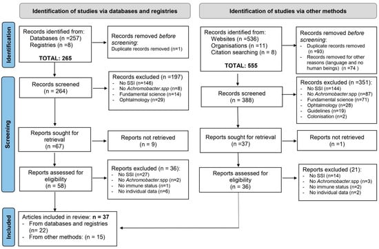 A comprehensive literature search was performed in the following databases, registries and search engines: MEDLINE via PubMed, Cochrane Library, Clinicaltrials.gov, GoogleScholar.com, Theses.fr. The search was completed by the analysis of “similar situations” on e-sin.santepubliquefrance.fr, the French reporting platform for healthcare-associated infections, and by the examination of the discussion board of cpias-ile-de-france.fr, a French website for the prevention of healthcare-associated infections. The search covered all publications up to and, including 30 September 2020, with no start date specified. Search terms were defined by two independent researchers and adapted to each repository by combining vocabulary, relevant MeSH terms, and keywords such as “Achromobacter”, “Alcaligenes xylosoxidans”, “surgery”, “surgical site infection”, “wound infection“, “nosocomial infection”, ” healthcare-associated infection”, “bacteraemia”, “endocarditis”, “meningitis”, “bacteraemia”, “ventriculitis”, “mediastinitis”,” abscess”, “peritonitis”, “burns”. When available, filters were applied to select studies in English and French languages and include those involving human subjects only. Additional studies were identified from the references provided by retrieved studies. The detailed search strategy adapted to each database or repository is provided as Supplementary File S1.