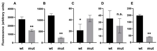 H. pylori cells were grown on TSA medium supplemented with kanamycin, and after 4–5 days, the cells were harvested and resuspended in phosphate buffer (pH 8.0, 15 mM KH2PO4 + 17 mM K2HPO4) to a final OD600 of 0.5. Samples were placed into in a Bio-One CELLSTARTM 96-well polystyrene round-bottom cell culture microplate (Greiner, Frickenhausen, Germany). A Biotek SynergyTM Mx Microplate Reader (Winooski, VT, USA) was used to detect fluorescence at 462 nm excitation and 510 nm absorbance, with a gain of 75. Three biological replicates and technical replicates were used to collect data for each reporter gene. Statistical analysis of the data was performed using an unpaired t-test with GraphPad Prism 9.0.2 (GraphPad Software, Inc., San Diego, CA, USA).