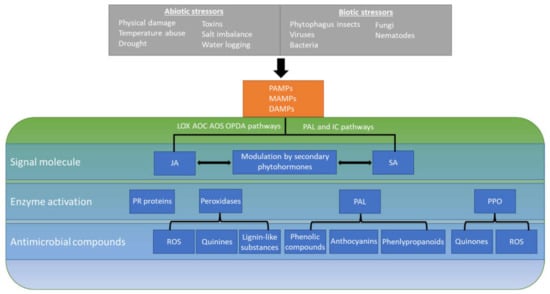 Damage to plant tissue in the form of mechanical injury, insect herbivory, and contamination with fungal and bacterial pathogens occurs throughout all phases of crop production. Compromised plant tissue is an important determinant of colonization by enteric pathogens. While S. enterica, L. monocytogenes, and E. coli are capable of internalizing into plant tissue through various openings [], their access to damaged tissue has been shown to promote their multiplication and survival [,,,,]. Once in contact with plant cells, in the plant apoplast or in injured tissue, enteric pathogens may face a chemical environment at least partly modulated by plant defenses. The plant response to stressors is governed chiefly by jasmonic acid (JA) and salicylic acid (SA) signaling molecules [,,,]. Activation and suppression of these pathways are further regulated by other phytohormones, which include ethylene, abscisic acid, auxin, gibberellins, cytokinins, and brassinosteroids []. The interactions between these pathways and hormones have been recently reviewed [] and are outside the scope of this review. Once induced, these plant defense molecules lead to signaling cascades that result in physiological changes and the synthesis of defense compounds (summarized in Figure 1). This review presents and discusses (1) the various phytochemicals produced by plants in the context of their defense to biotic and abiotic stresses that may antagonize the viability and multiplication of enteric pathogens in the plant environment, (2) the known mechanisms of antimicrobial activ-ity of some of these compounds, (3) their effect on enteric pathogen behavior and fit-ness on/in plants, and (4) potential applications of phytochemical production in pro-duce safety.
