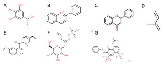 Basic structure of secondary metabolite classes with known antimicrobial properties. (A) Tannin (gallic acid). (B) Anthocyanin (flavylium). (C) Flavonoid. (D) Terpenoid (isoprene). (E) Alykyloid (quinine). (F) Allylglucosinolate. (G) Polyphenol (lignin).