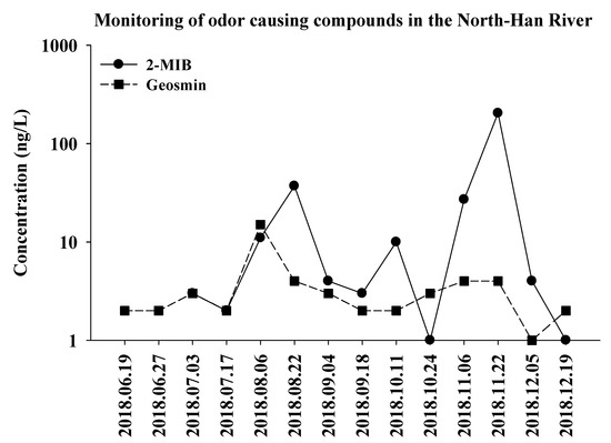 The reason for the odor issues in the North Han River were investigated by monitoring the odor-causing compounds in the freshwater samples taken during all seasons in 2018. Freshwater samples were collected from the influent source water in the drinking water treatment system near the river side (Figure 1). Then the odor-causing compounds, including geosmin and 2-MIB, were monitored in the freshwater samples using a GC-MS instrument.