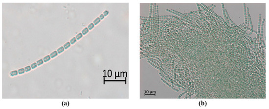Phase contrast optical micrograph of Pseudanabaena yagii GIHE-NHR1 from the North Han River showing (a) its natural state, and (b) the mat form.