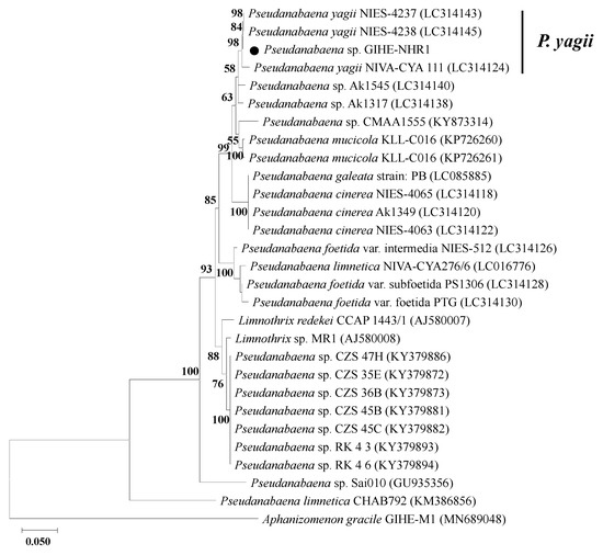 Molecular phylogenetic analyses using the 16S rRNA gene and 16S-23S rRNA ITS sequences were performed to identify the taxonomic affiliation of isolated Pseudanabaena-like species (Figure 5). The phylogenetic analysis compared the 16S rRNA and 16S-23S rRNA ITS sequences of the isolated species with their closest relatives. The sequence retrieved from the isolate in this study was taxonomically affiliated to the Pseudanabaena genus and showed a deep branch with the closest relative, P. yagii (Figure 5). Based on the results of the phylogenetic analysis, the isolated species was named Pseudanabaena yagii GIHE-NHR1.