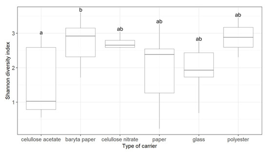 The Shannon diversity index showed (Figure 1) that the significant difference (padj < 0.05, Tukey HSD) in fungal biodiversity was only between two types of carriers, namely cellulose acetate and baryta paper. This finding is not surprising, as these two carriers are used for different types of audio–visual material. Cellulose acetate is a typical carrier for film reels [23], while baryta paper has been used for photographic positives [24].