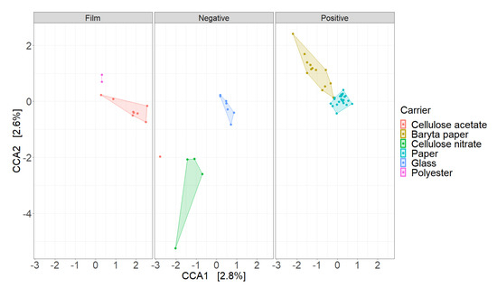 Canonical correspondence analysis (CCA) demonstrates the similarity of fungal community structures between different audio–visual materials (film, negative, and positive) and carriers (cellulose acetate, baryta paper, cellulose nitrate, paper, glass, and polyester).