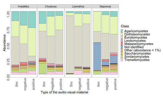 The relative abundance of fungal classes on different types of the audio–visual materials (film, negative, and positive) at different localities (Hradištko, Chodovec, Litoměřice, and Nepomuk).