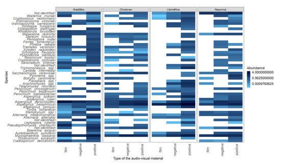 Heat map of 50 most abundant fungal species on the audio–visual materials (film, negative, and positive) at the different localities (Hradištko, Chodovec, Litoměřice, and Nepomuk). A white field indicates the absence of the corresponding species in the sample.