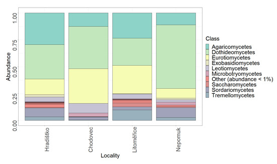 Relative abundance of fungal classes in the air at different localities (Hradištko, Chodovec, Litoměřice, and Nepomuk).