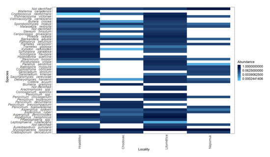 Heat map of 50 most abundant fungal species in the air at different localities (Hradištko, Chodovec, Litoměřice, and Nepomuk). A white field indicates the absence of the corresponding species in the sample.