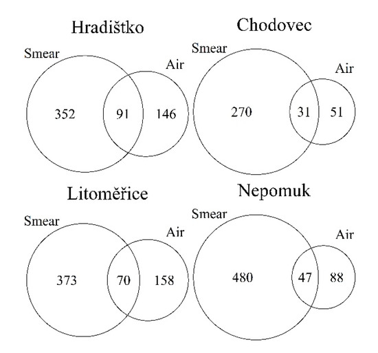 Based on the clear link between the fungi identified in air and on audio–visual materials, the total distribution of ASVs in the air and on the audio–visual materials was analysed using Venn diagrams (Figure 7). The ASVs occurring both on smears and in the air confirmed that the air microbiota might be one of the primary causes of audio–visual microbial contamination. At Hradištko, up to 20.5% of the fungi could come from the air, 15.8% at Litoměřice, 10.3% at Chodovec, and 8.9% at Nepomuk. The percentage may be related to the number of ASVs in the air. The lowest number of ASVs (and also the lowest percentage) was at Chodovec. The reason could be the usage of filters in the ventilation systems. The H12 class filters at Chodovec belong to high-efficiency particulate air filters, the so-called HEPA filters [43]. It has been shown that the use of HEPA filters leads to a significant reduction in microorganisms in the air [44]. This class of filters is characterised by its high efficiency (99.99%) for particles > 0.3 μm. In contrast, at Nepomuk were the M5 class of filters. This class belongs to the medium filters group, which has efficiencies between 60 and 90% [45]. However, even there, a lower number of ASVs in the air was found. As already mentioned in Table 1, the archives at Litoměřice and Hradištko do not use filters. Thus, the number of ASV in the air was higher in these archives.