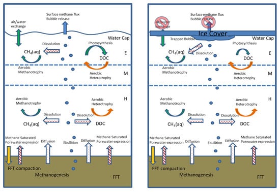 Sustained dissolved oxygen concentrations within the water cap are critical to the long-term viability of pit lakes. Dissolved oxygen is also essential for aerobic respiration and, therefore, the development of a functioning aquatic ecosystem. In addition, oxygen supports the microbial degradation of potentially hazardous organic compounds, such as naphthenic acids (NAs), present in the oil sands' process-affected water and associated with fluid tailings []. However, the oxygen supplied by physical and biological processes can be microbially depleted via reactions with methane and other oxygen-consuming constituents released from fluid tailings [,,]. On the basis of observations from tailing ponds and laboratory studies, microbial methanogenesis is presumed to be continuing to produce methane within the FFT underlying BML [,,,,,] (Figure 1). This methane can be transported to the overlying water cap through three main processes: (1) Advective transport during FFT settlement and dewatering; (2) Diffusive transport across concentration gradients; and (3) The dissolution of gaseous methane from bubbles migrating vertically from FFT through the water cap and released at the lake surface (Figure 1). Once in the oxic water column, this methane can be consumed via the action of aerobic methanotrophic microbes, or, alternatively, it may partition out of the water column at the air–water interface. The same transport processes can also deliver organic carbon constituents (e.g., residual petroleum hydrocarbons) from the FFT to the water column that may be consumed by aerobic heterotrophic microbes, alongside the heterotrophic consumption of any photosynthetically produced dissolved organic carbon (DOC). Indeed, Risacher et al. (2018), and Arriaga et al. (2019) found that the oxygen concentrations and distribution in the BML water column, during early time points in lake development (2015–2016), were correlated with methane concentrations and the rates of the downward physical mixing of the oxygen supply and depth-dependent consumption. Their results imply that FFT-associated microbial methane production, the mobilization to, and the subsequent oxidation within the water cap, was playing an important role in influencing the oxygen concentrations.