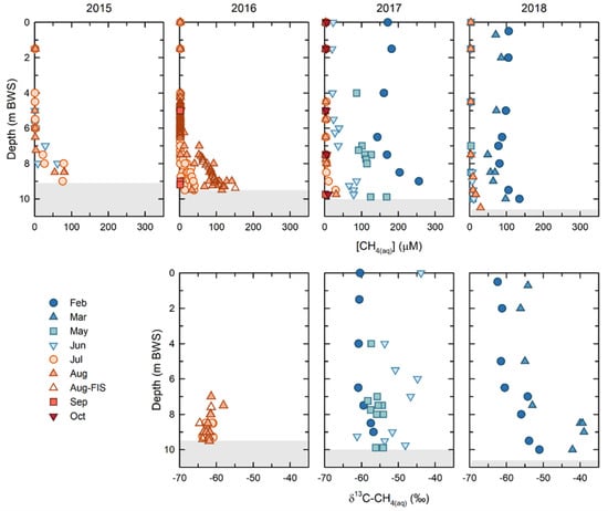 Dissolved methane concentrations (μM) and isotopic compositions (δ13C) for 2015, 2016, 2017, and 2018. Under-ice samples (February and March) were only obtained in 2017 and 2018. The shaded region at the bottom shows the depth of the FFT and its settlement over time.
